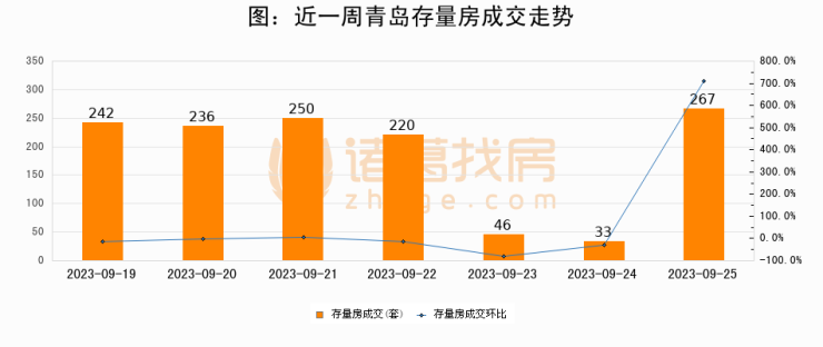 从存量房来看,2023年09月25日青岛存量房单日成交267套,比昨日增加234套,环比上涨709.1%。从近一周存量房成交来看,青岛存量房日均成交套数为184套,09月25日单日成交267套,高于近一周平均水平45.1%。