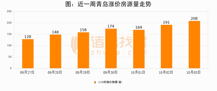 根据诸葛找房数据显示,青岛24小时涨价房源量为208套,较10月02日增加17套,环比上涨8.9%。与此同时,涨价房源占比小幅扩大,业主信心有所提升。