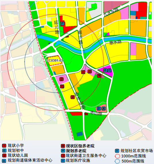 1.教育设施:周边2处小学(现状铜川路小学、LC0301-06小学),2处幼儿园(惠水路幼儿园、LC0301-07幼儿园),规划1处初中。