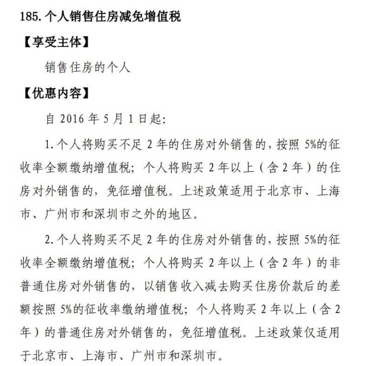 对于个人销售住房减免增值税的条件也未调整。即个人将购买不足2年的住房对外销售的,按照5%的征收率全额缴纳增值税;个人将购买2年以上(含2年)的住房对外销售的,免征增值税。对于一线城市而言,个人将购买2年以上(含2年)的非普通住房对外销售的,以销售收入减去购买住房价款后的差额按照5%的征收率缴纳增值税。