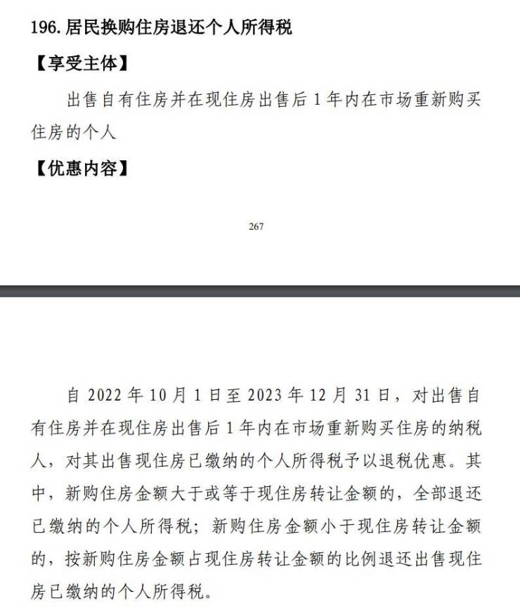 居民换购住房退还个人所得税政策也已于2022年发布。按照规定,自2022年10月1日至2023年12月31日,对出售自有住房并在现住房出售后1年内在市场重新购买住房的纳税人,对其出售现住房已缴纳的个人所得税予以退税优惠。其中,新购住房金额大于或等于现住房转让金额的,全部退还已缴纳的个人所得税;新购住房金额小于现住房转让金额的,按新购住房金额占现住房转让金额的比例退还出售现住房已缴纳的个人所得税。