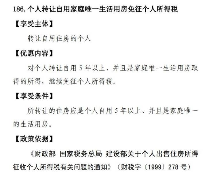 对此,国家税务总局纳税咨询热线相关工作人员表示,政策指引主要梳理了税费优惠政策,具体优惠内容和享受条件在《支持协调发展税费优惠政策指引汇编》中有所明确,比如“个人转让自用家庭唯一生活用房免征个人所得税”一项,仍要求所转让的住房应是个人自用5年以上、并且是家庭唯一的生活用房。