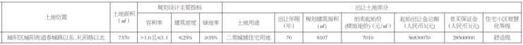 第六批次就一宗地,位于城阳区城阳街道春城路以东、礼阳路以北,占地面积7370㎡,容积率仅1.1,建筑面积约8107㎡,建筑密度25%,绿地率35%。楼面起拍价7010元/㎡,起拍总价5683万元,竞买保证金2850万元,比例为50%。