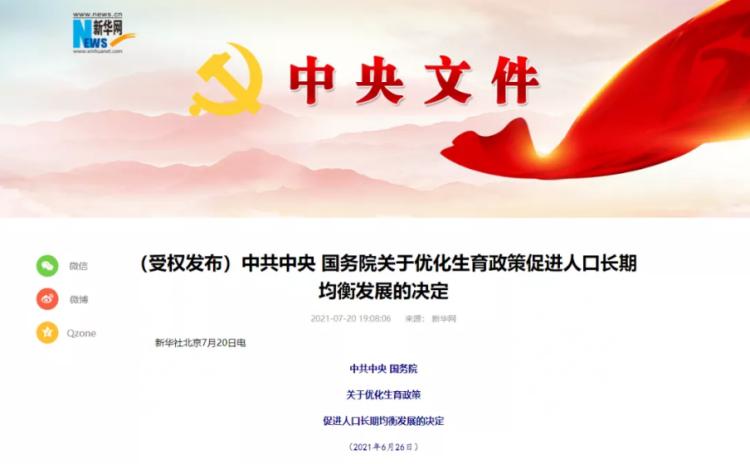 7月20日晚,中共中央、国务院发布关于优化生育政策,促进人口长期均衡发展的决定。