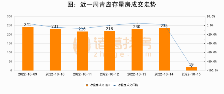 从存量房来看,2022年10月15日青岛存量房单日成交19套,比昨日减少216套,环比下降91.9%。从近一周存量房成交来看,青岛存量房日均成交套数为198套,其中10月09日成交量较高为241套,10月15日单日成交19套,低于近一周平均水平90.4%。