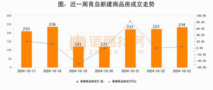 根据青岛市住房和城乡建设局数据显示,2024年10月23日青岛新建商品房成交234套,较昨日增加11套,环比上涨4.9%