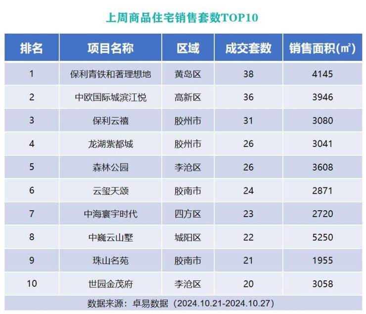 从各项目成交套数来看,位于西海岸新区的保利青铁和著理想地以成交38套的成绩列榜单首位;位于高新区的中欧国际城滨江悦以成交36成绩上榜第二位;位于胶州市的保利云禧以成交31套的成绩列榜单第三位。
