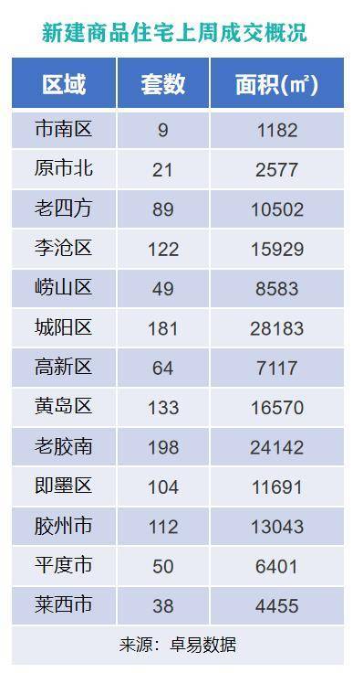 从各区成交情况来看,上周城阳区新建商品住宅以成交面积28183㎡的成绩,位列上周各片区新建商品住宅成交面积榜首位;原胶南市以成交面积24142㎡的成绩,位列成交面积榜第二位;原黄岛区以成交面积16570㎡的成绩,位列成交面积榜第三位。
