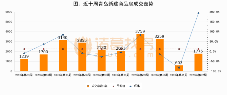 进入2023年第42周(10月09日-10月15日),青岛新建商品房成交1775套,较上周增加1172套,环比上涨194.4%