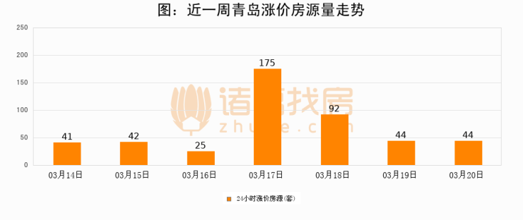 根据诸葛找房数据显示,青岛24小时涨价房源量为44套,较03月19日持平。