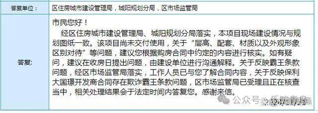 城阳区住房城市建设管理局,城阳规划分局,区市场监管局答复,经区住房城市建设管理局、城阳规划分局落实,本项目现场建设情况与规划图纸一致。该项目尚未交付使用,关于“层高、配套、材质以及外观形象区别对待”等问题,建议您根据购房合同中约定的内容进行核实。如有疑问,建议在收房日提出问题,由建设单位进行沟通解释。关于反映霸王条款问题,经区市场监管局落实,工作人员已与您了解合同内容,关于反映保利大国璟开发商合同存在欺诈霸王条款问题,区市场监管局已受理且正在核查当中,相关处理结果会于法定时间内答复您。