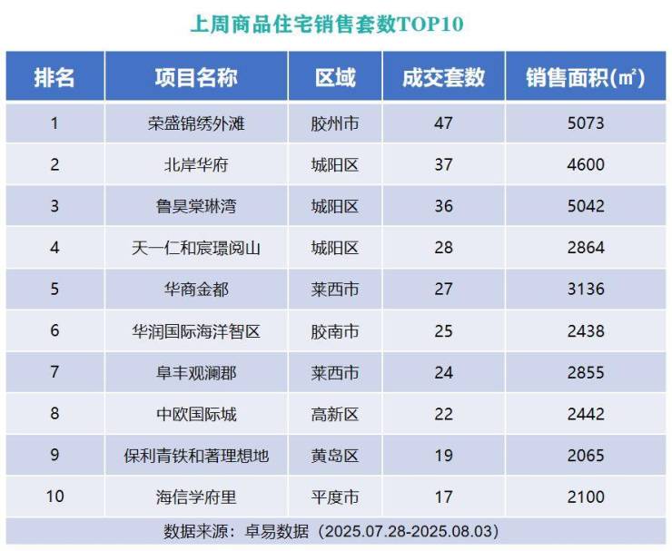 此外,天一仁和宸璟阅山、华商金都、华润国际海洋智区、阜丰观澜郡、中欧国际城、保利青铁和著理想地和海信学府里等项目进入销售榜前十位。上周青岛新建商品住宅成交前十榜单中,以北岸城区项目为主,主城区无项目上榜。
