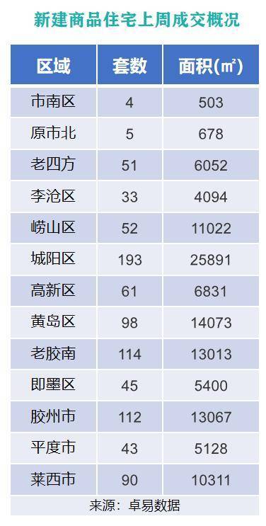 从各区成交情况来看,上周城阳区新建商品住宅以成交面积25891㎡的成绩,位列上周各片区新建商品住宅成交面积榜首位;原黄岛区以成交面积14073㎡的成绩,位列成交面积榜第二位;胶州市以成交面积13067㎡的成绩,位列成交面积榜第三位。