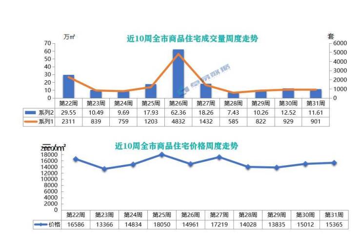 价格方面,上周青岛新建商品住宅均价为15365元/㎡,上涨353元/㎡,涨幅为2.35%。
