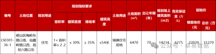 LS0301-36-1地块位于王家村梅岭东路以南、规划六路以东,占地面积6470㎡,容积率2.2,建面14234㎡,建筑密度30%,绿地率35%,建筑高度54米;起拍楼面地价22039元/㎡,起拍总价3.14亿元。