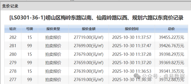 10月30日,崂山区前海一线王家村36-1地块拍卖,引来海信、青特、昆仑、海业益佳4家(都是本土)房企报名,经过282轮竞争耗时俩个多小时海信竞得,成交楼板价27719元/㎡(高于君一的26500元/㎡),成交总价3.95亿,溢价率25.77%。