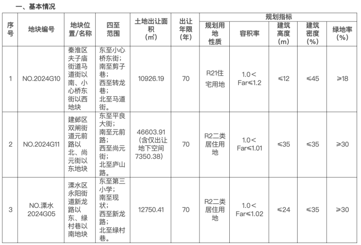 NO.2024G10地块为秦淮区夫子庙街道马道街以南、小心桥东街以西地块。地块东至小心桥东街;南至剪子巷;西至转龙巷;北至马道街。规划用地性质为R21住宅用地,出让面积10926.19平方米,容积率1.0<Far≤1.2,建筑高度≤12米。挂牌起始价38200万元,起始楼面价29135元/平方米。