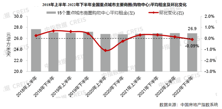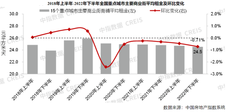 据中指研究院数据,2022年下半年全国商业街商铺租金环比跌幅扩大至0.71%,商圈(购物中心)商铺租金环比止涨转跌,跌幅为0.09%