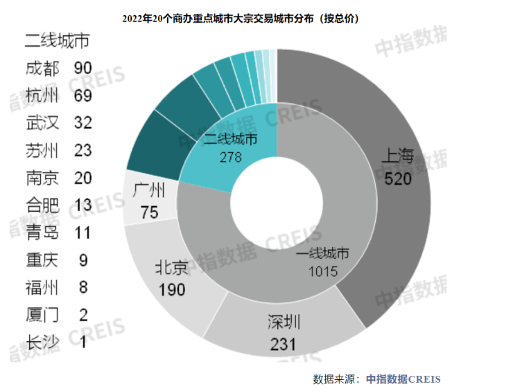 据中指研究院统计,2022年中指数据监测的20个商办重点城市共监测到大宗交易141宗,较2021年减少78宗;交易额1294亿元,同比下降50%。