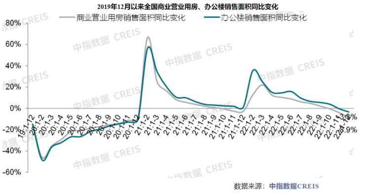 “宏观方面,疫情拖累服务业经济及消费市场,进而对商业地产行业造成冲击,商办用房开工投资、销售面积同比均下降,商办用地供需规模缩量,市场整体面临下行压力。”中指研究院分析认为。