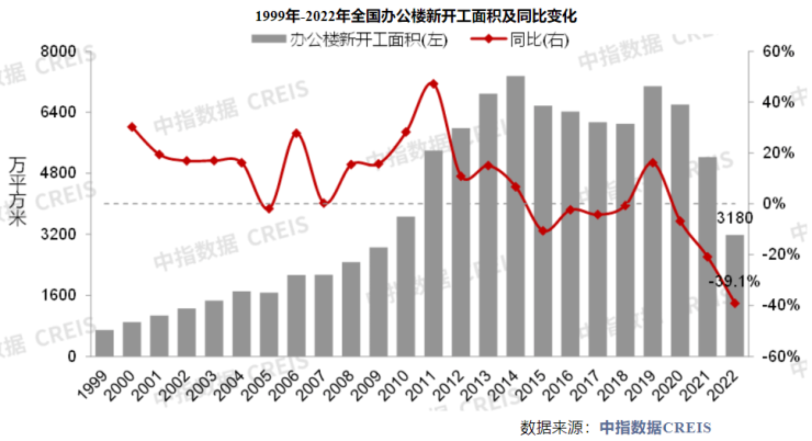 中指研究院数据显示,2022年商业营业用房、办公楼开工投资、销售面积同比均下降,二季度以来商办物业销售面积单月增速持续为负。