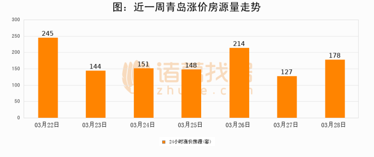 根据诸葛找房数据显示,青岛24小时涨价房源量为178套,较03月27日增加51套,环比上涨40.2%。与此同时,涨价房源占比小幅扩大,业主信心有所提升。