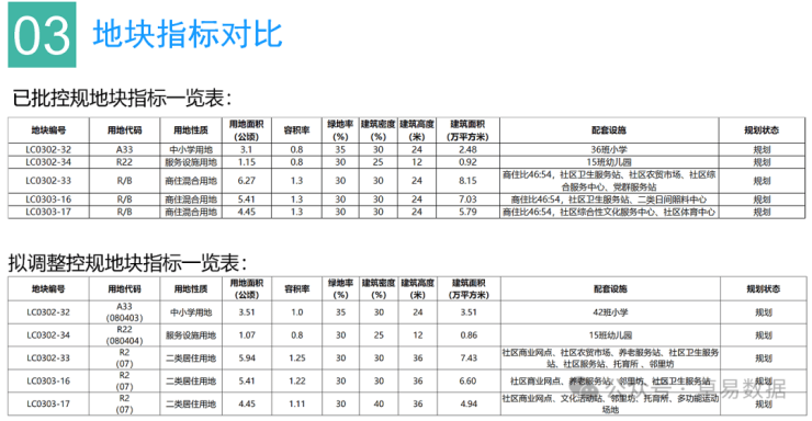 变化二:将LC0302-32地块小学班额由36班提升至42班、用地面积由3.1公顷提升至3.51公顷,LC0302-34地块15班幼儿园班额不变,用地规模按照《青岛市市区公共服务设施配套标准及规划导则》进行修正。