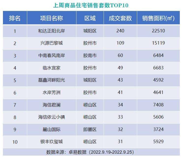 从各项目成交套数来看,位于城阳区的和达正阳北岸以成交240套,销售面积22510㎡的成绩列榜单排名前列;位于胶州市的兴源巴黎城以成交109套,销售面积15119㎡的成绩上榜第二位;位于原胶南市的中南春风南岸以成交60套,销售面积6484㎡的成绩列第三位。