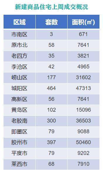从各区成交情况来看,上周胶州市新建商品住宅成交397套,成交面积为50460㎡,位列上周各片区新建商品住宅成交面积榜首位;城阳区以成交464套,成交面积47313㎡的成绩位列新建商品住宅成交套数榜首位;原胶南市以成交300套,成交面积36503㎡的成绩位列榜单的第三位。