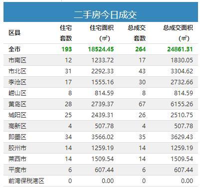 14日全市二手房成交264套,总成交面积24861.31㎡,包括住宅193套,成交面积18524.45㎡。(图为各区市住宅交易量数据)