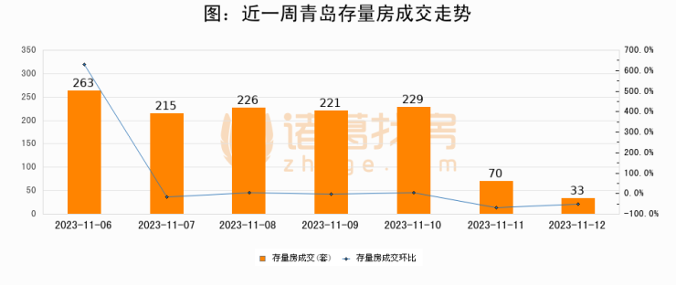 从存量房来看,2023年11月12日青岛存量房单日成交33套,比昨日减少37套,环比下降52.9%。从近一周存量房成交来看,青岛存量房日均成交套数为179套,11月12日单日成交33套,低于近一周平均水平81.6%。