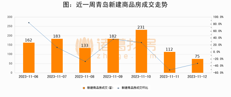 根据青岛市住房和城乡建设局数据显示,2023年11月12日青岛新建商品房成交75套,较昨日减少37套,环比下降33%