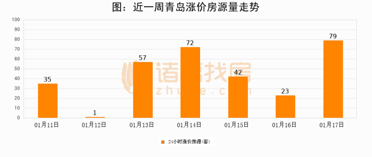 根据诸葛找房数据显示,青岛24小时涨价房源量为79套,较01月16日增加56套,环比上涨243.5%。与此同时,涨价房源占比小幅扩大,业主信心有所提升。