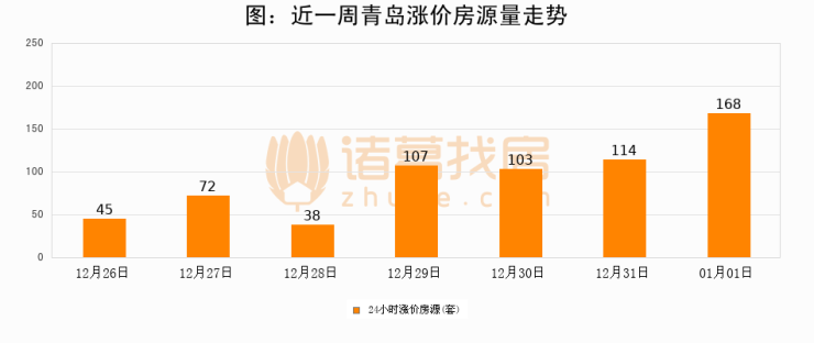 根据诸葛找房数据显示,青岛24小时涨价房源量为168套,较12月31日增加54套,环比上涨47.4%。与此同时,涨价房源占比小幅扩大,业主信心有所提升。