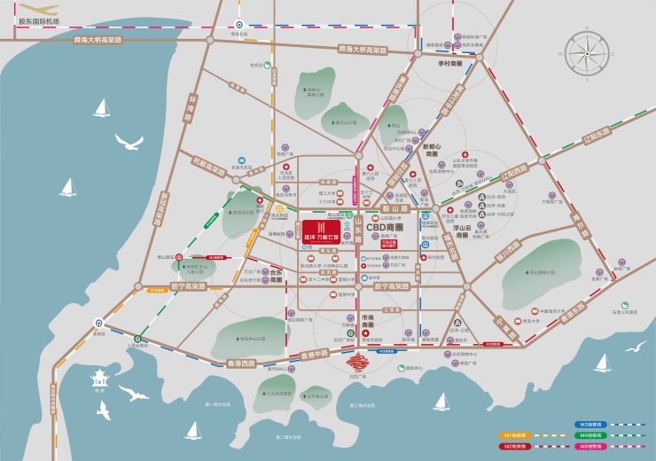 从早期的城市名片家乐福,到时代的图腾海泊河,再到繁华璀璨的万象城、风驰电掣的地铁贯通……山东路中轴,这些地标为之烙下了时代发展的印记,交通、商圈、生态、医疗、学府等全面围合,将青岛这条城市黄金中轴的价值淋漓尽显。