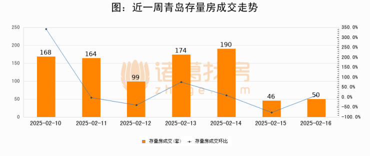 从存量房来看,2025年02月16日青岛存量房单日成交50套,比昨日增加4套,环比上涨8.7%。从近一周存量房成交来看,青岛存量房日均成交套数为127套,02月16日单日成交50套,低于近一周平均水平60.6%。