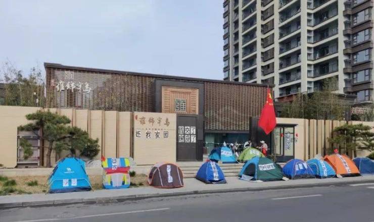 现在好了,青岛的业主们呼天不应叫地不灵,只好在售楼处门前搭起了帐篷,贴上维权标语,以期引来路人几许关注。