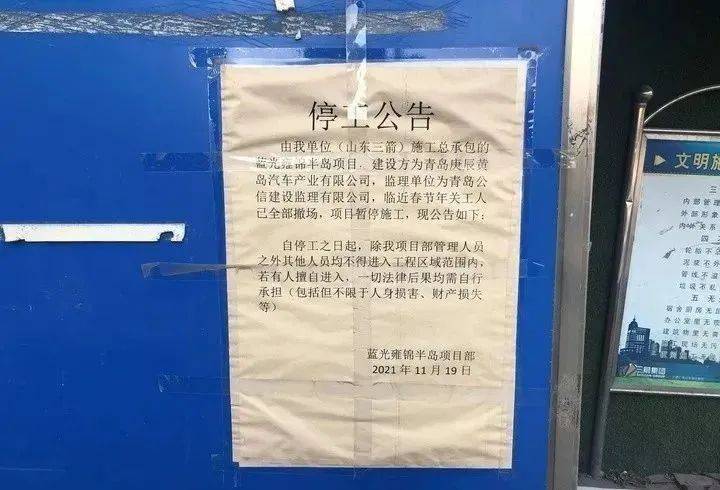 2022年3月初,蓝光雍锦半岛业主爆料,称西海岸五台山路附近的蓝光雍锦半岛,已于去年11月19日停工,至今尚未复工,施工总承包单位山东三箭已经撤出,售楼处也对外关闭,业主担心项目很可能无法按期交房,甚至存在烂尾风险。据了解,大量业主曾多次与开发商沟通都没有获得明确答复。