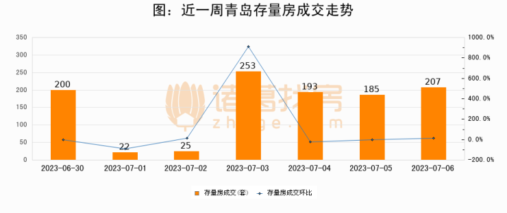 从存量房来看,2023年07月06日青岛存量房单日成交207套,比昨日增加22套,环比上涨11.9%。从近一周存量房成交来看,青岛存量房日均成交套数为155套,07月06日单日成交207套,高于近一周平均水平33.5%。