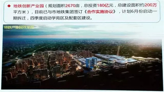 地铁创新产业园:规划面积2670亩,总投资180亿元,目前已与市地铁集团签订《合作实施协议》,计划6月份启动一期拆迁,四季度启动学苑区及配套区建设。