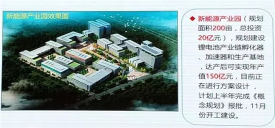 新能源产业园:规划面积200亩,总投资20亿元,规划建设锂电池产业链孵化器、加速器和生产基地,达产后可实现年产值150亿元,目前正在进行方案设计,计划上半年完成《新能源产业园概念规划》报批,11月份开工建设。