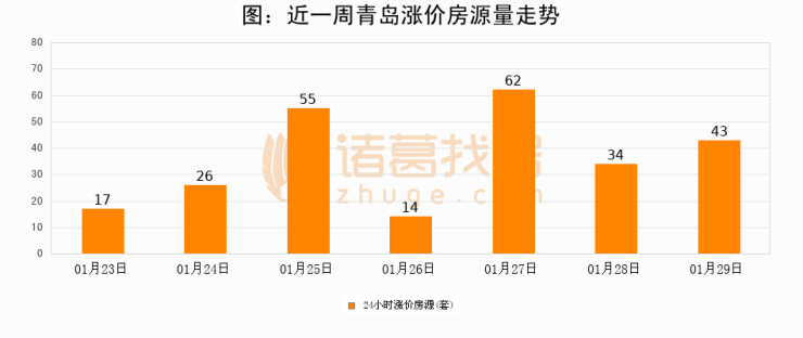 根据诸葛找房数据显示,青岛24小时涨价房源量为43套,较01月28日增加9套,环比上涨26.5%。与此同时,涨价房源占比小幅扩大,业主信心有所提升。