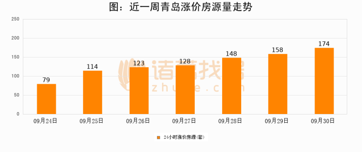 根据诸葛找房数据显示,青岛24小时涨价房源量为174套,较09月29日增加16套,环比上涨10.1%。与此同时,涨价房源占比小幅扩大,业主信心有所提升。