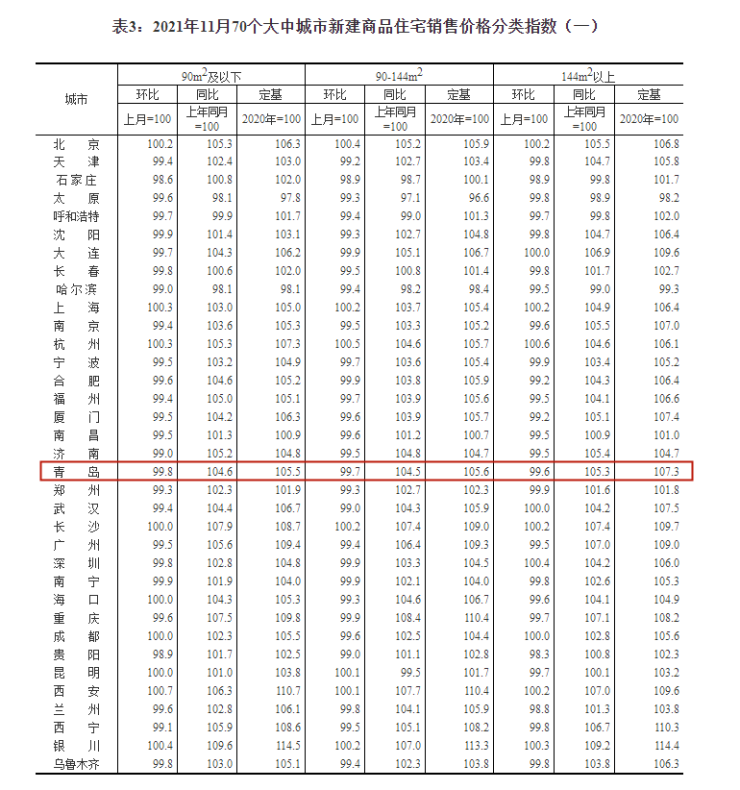 12月15日,国家统计局发布了2021年11月份70个大中城市商品住宅销售价格变动情况。数据显示,全国70个大中城市中,新建商品住宅销售价格环比下降的城市有59个,上涨的城市有9个,持平的城市有2个;较高涨幅为0.7%,较低为下降1.2%。二手住宅销售价格环比下降的城市有63个,上涨的城市有3个,持平的城市有4个;较高涨幅为0.4%,较低为下降1%。在全国楼市大降温的环境下,青岛11月新建商品住宅和二手住宅的销售价格迎来普降,分别下降了0.3%和0.4%。