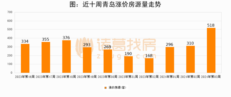 从调价房源来看,第2周青岛涨价房源518套,较上周上涨67.1%。与此同时,2周涨价房源占比回落0.45个百分点,业主信心小幅波动,购房者可则需入市。