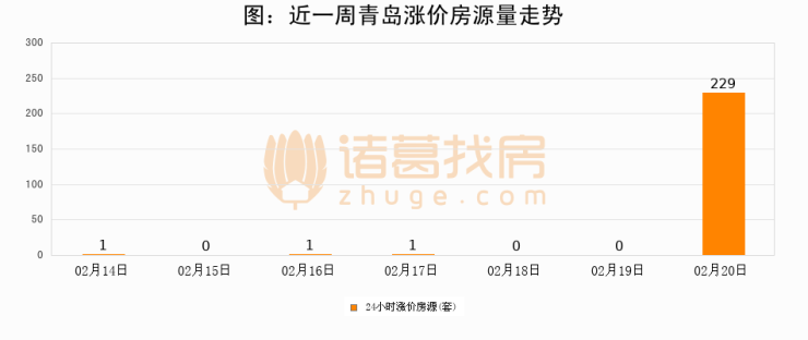 根据诸葛找房数据显示,青岛24小时涨价房源量为229套,较02月19日增加229套,环比上涨0%。与此同时,涨价房源占比小幅扩大,业主信心有所提升。