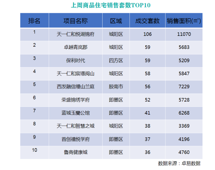 从各项目成交情况(成交套数)来看,位于城阳区的天一仁和悦湖锦府以成交106套,销售面积11070㎡的成绩列榜单排名前列;据悉,天一仁和悦湖锦府目前在售建面80和96㎡高层住宅,价格11000元/㎡。