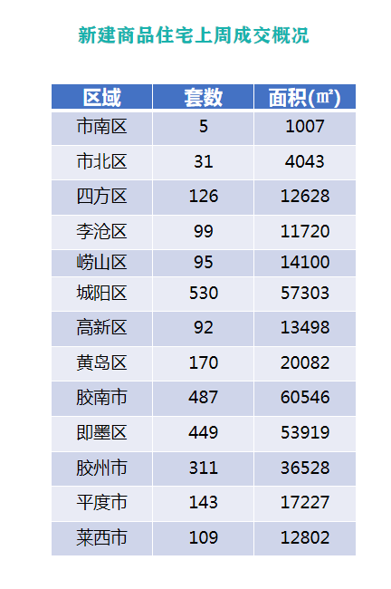 从各区成交情况来看,上周原胶南市新建商品住宅成交487套,成交面积为60546㎡,位列上周各片区新建商品住宅成交面积首位;城阳区成交530套,成交面积57303㎡的成绩位列上周各片区新建商品住宅成交套数首位。