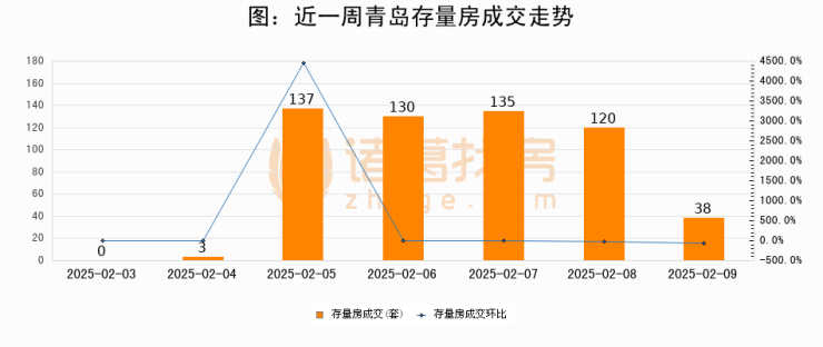 从存量房来看,2025年02月09日青岛存量房单日成交38套,比昨日减少82套,环比下降68.3%。从近一周存量房成交来看,青岛存量房日均成交套数为80套,02月09日单日成交38套,低于近一周平均水平52.5%。
