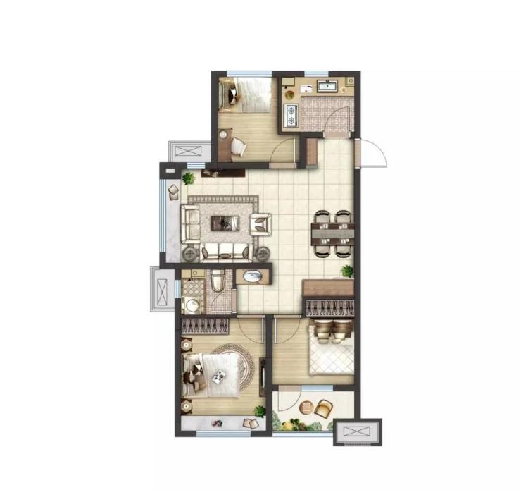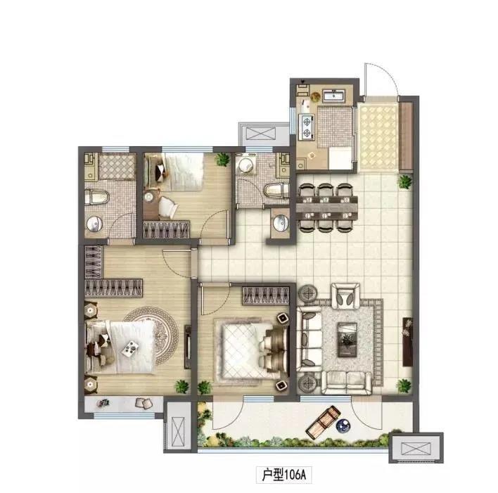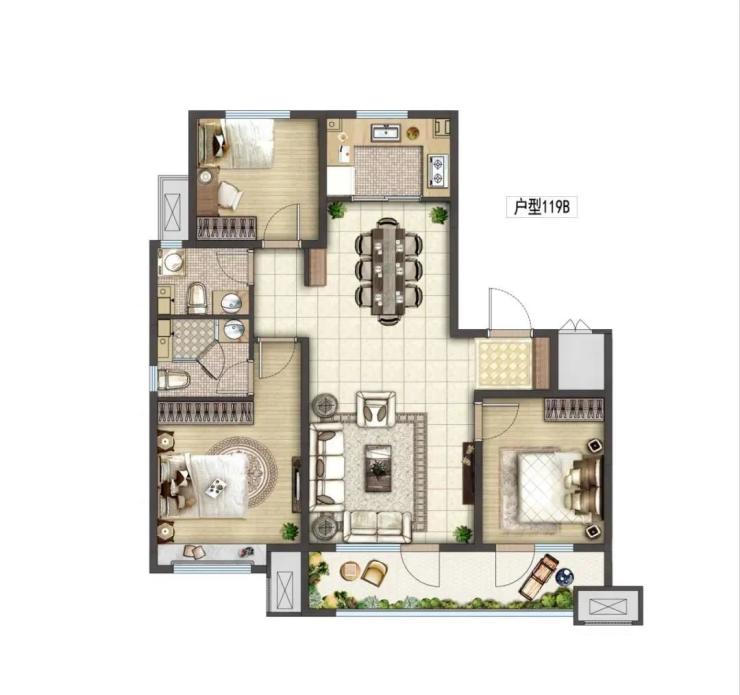 建面约119㎡三室两厅两卫户型,较大亮点就是三间卧室分别位于套间三个角落,充分保护每位家庭成员的个人隐私。